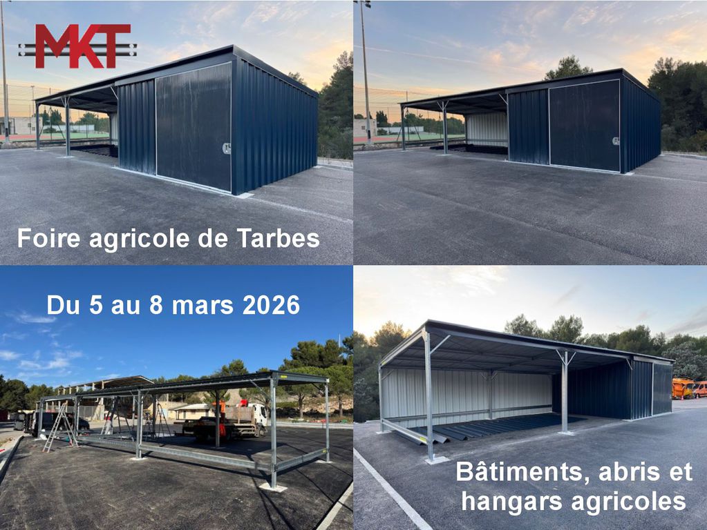 La foire agricole de Tarbes aura lieu du 5 au 8 mars 2026. Nous serons présents avec notre gamme de charpentes métalliques et bâtiments agricoles les moins chers du marché ainsi que nos hangars en kit. A cette occcasion nous vous ferons bénéficier de remises exceptionnelles. vous pourrez également nous consulter pour la fourniture de bac acier en tôles profilées pour le bardage et la couverture. Pour les particuliers qui ont des projets d'abris de jardins ou de car ports pour les voitures, nous effectuerons les devis sur place avec les mêmes remises que pour les agriculteurs. Nous exposerons des abris pour les ovins, bovins ou porcins au paturage dans les prairies adaptés pour la sécurité de chaque espèce animale. L'élevage avec le confort pour les animaux, demandez nous un devis en ligne. Nos charpentes métalliques sont souvent utilisées par des artisans pour des ateliers d'exploitation et parfois ils aménagent des espaces de vie à l'intérieur qui servent de maison d'habitations car en tant que fabricants nous avons les assurances "garantie décennale" et "garantie constructeur". Toutes les structures de nos bâtiments ainsi que les chéneaux sont galvanisés, c'est utile dans le cas de stockage de déchets corrosifs.